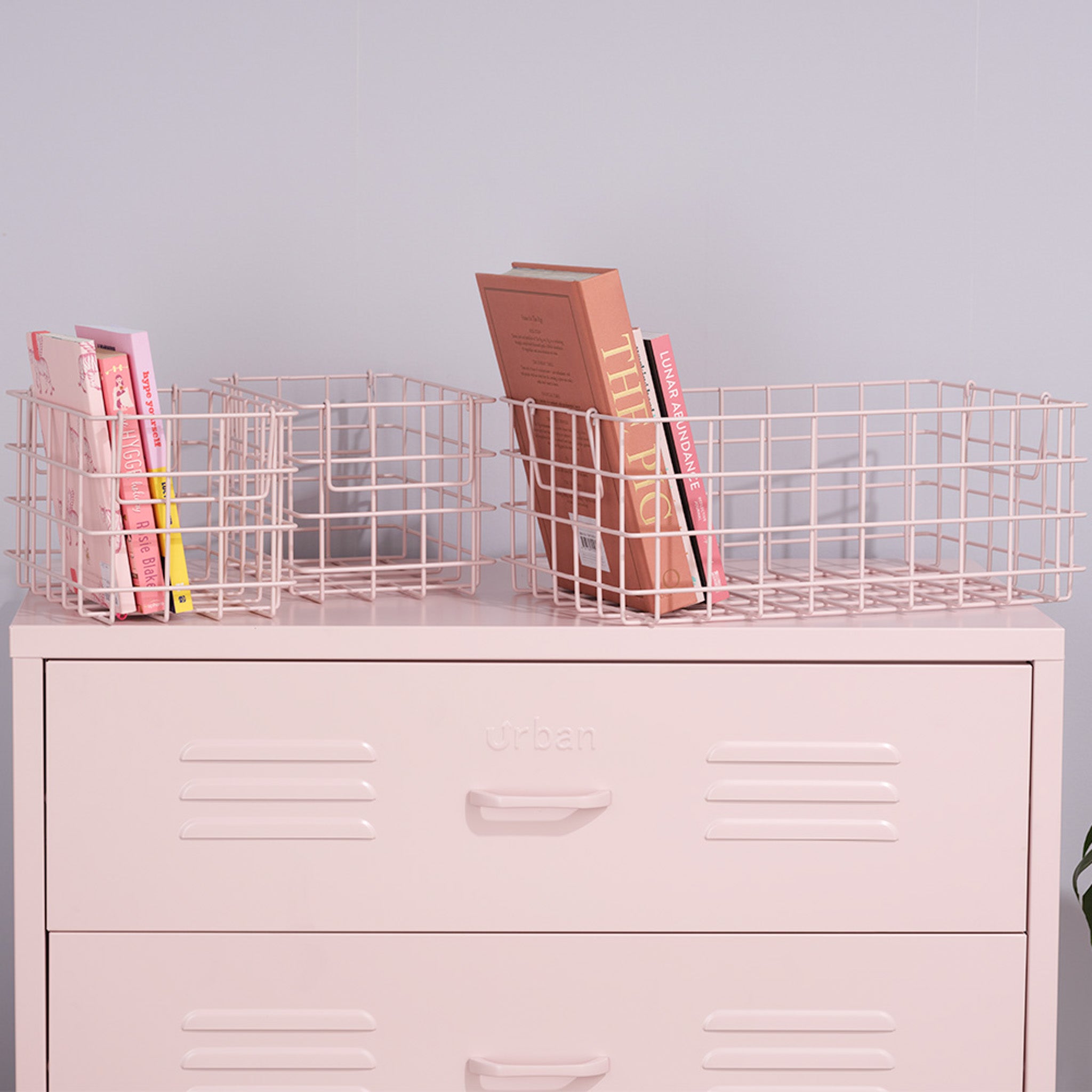 Our Urban baskets are created in durable metal and finished in Light Pink, they are a great addition to organise and style our storage lockers or drawers. The set of 3 baskets comes with one large and two medium baskets.